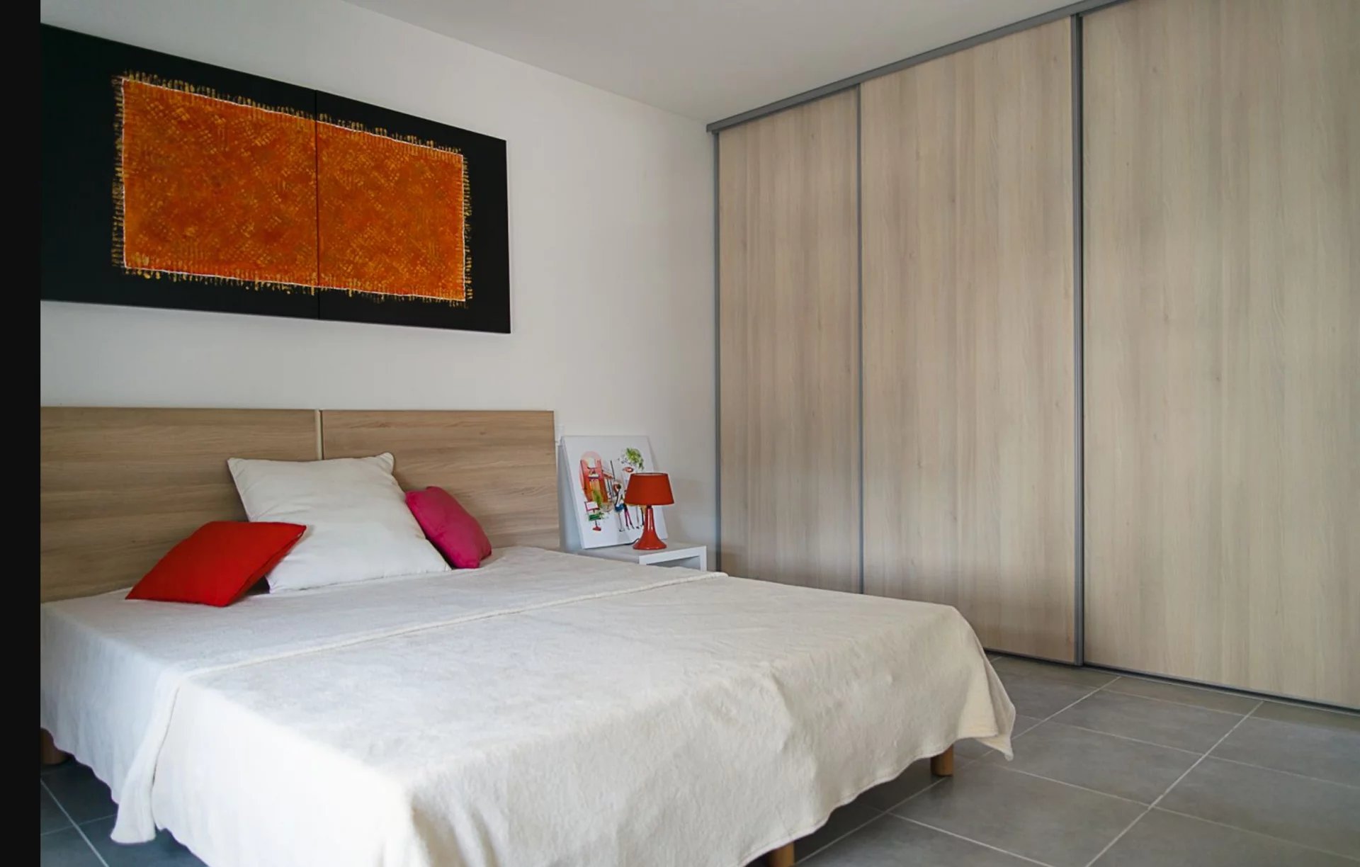 L’appartement se compose d’une entrée avec placard, un séjour avec cuisine ouverte donnant sur la vaste terrasse ensoleillée, 2 chambres, une salle de bains et un wc séparé.