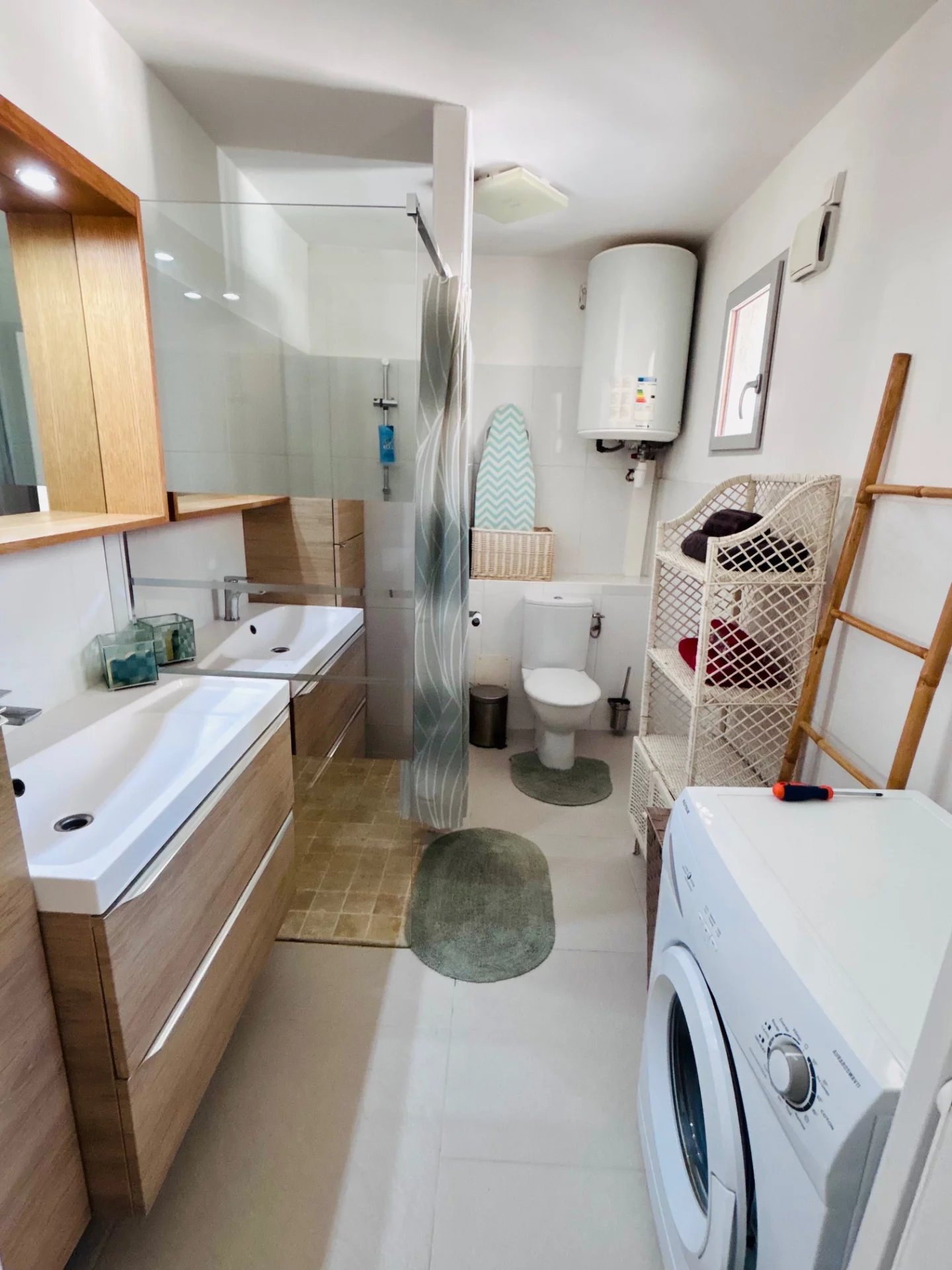 Le Bien se compose au rez de chaussée d’un séjour lumineux avec baie vitrée et climatisation, une cuisine aménagée et équipée avec baie vitrée également et une salle d’eau avec douche italienne et WC.