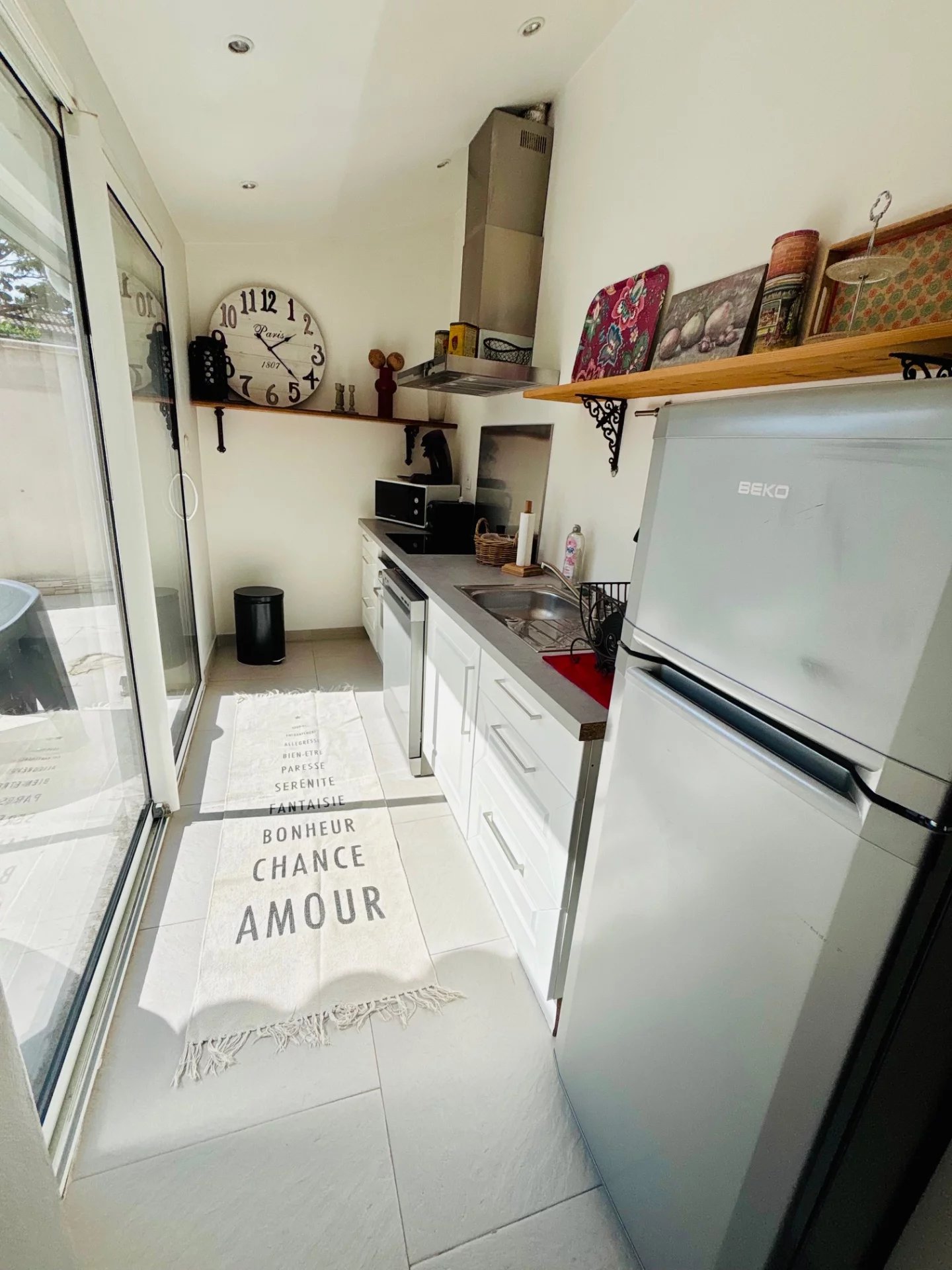Le séjour et la cuisine s’ouvrent sur une terrasse de 21 m² exposée Ouest, suivie d’un jardin d’environ 70 m² clos et ombragé par quelques arbres.