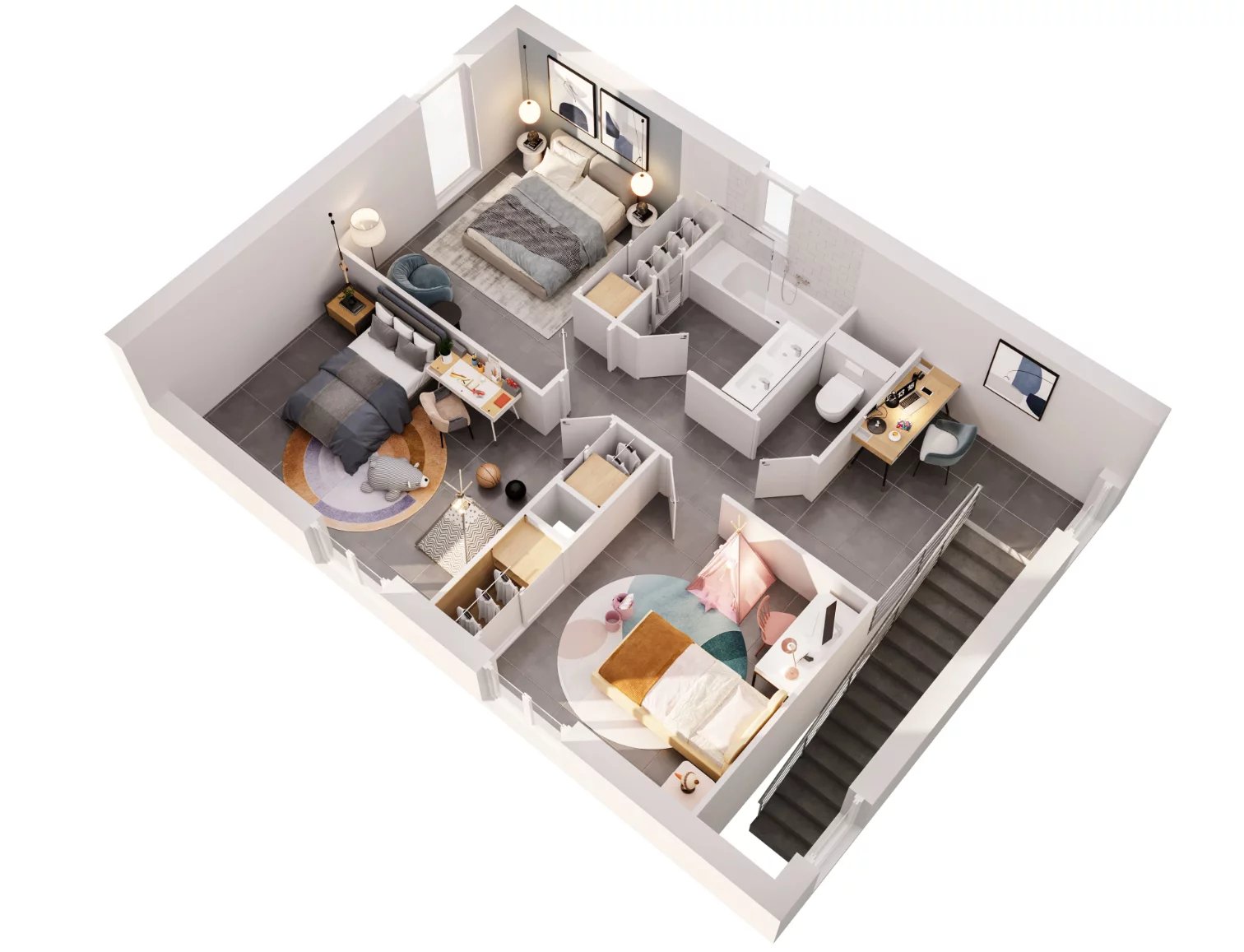 A 1er étage, nous retrouvons 3 chambres, un bureau, une salle de bains et des wc séparés.