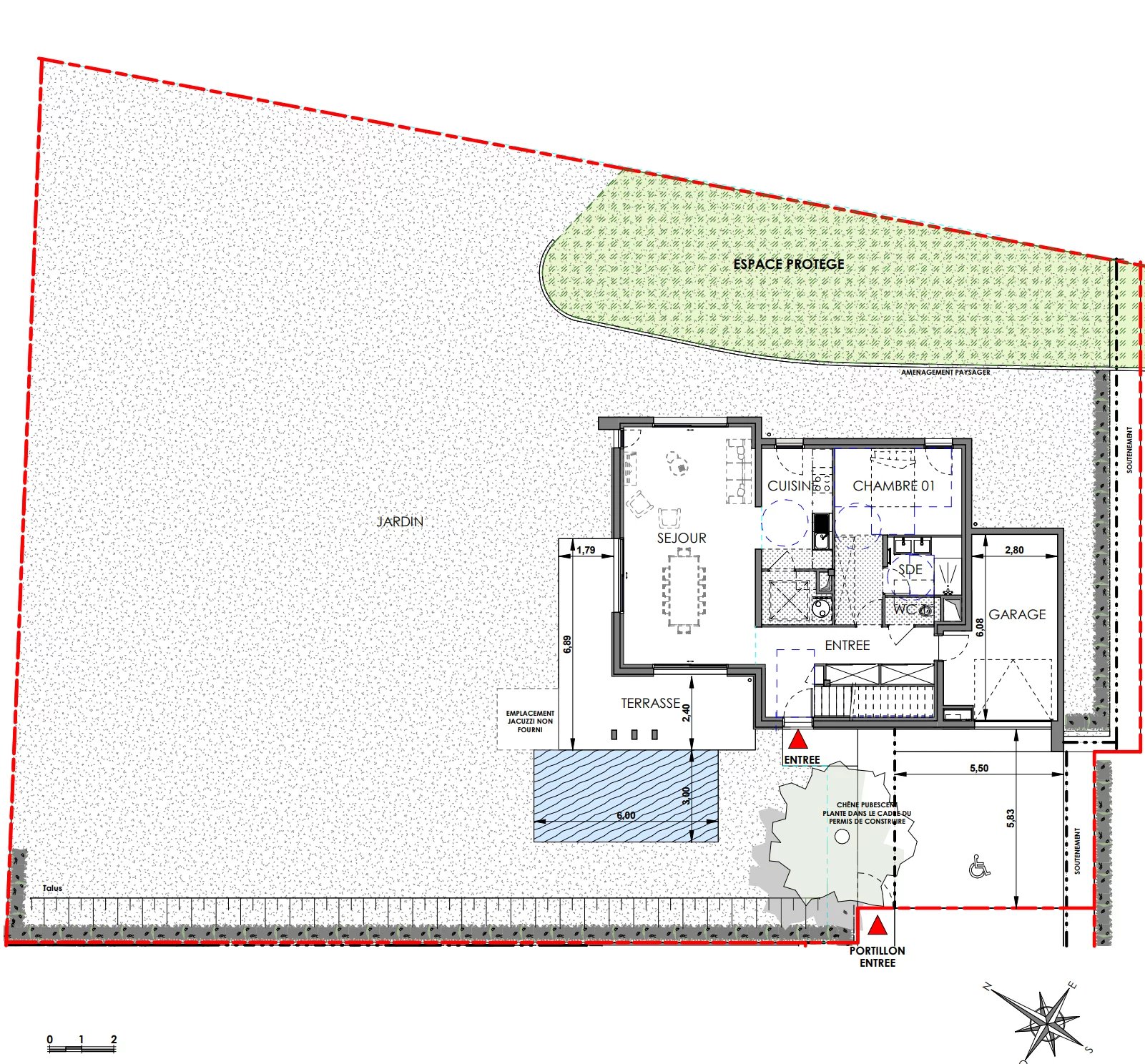 Concernant les extérieurs, la maison bénéficie d’une terrasse de 23 m² exposée Ouest, d’une piscine et d’un jardin clos de 662 m².