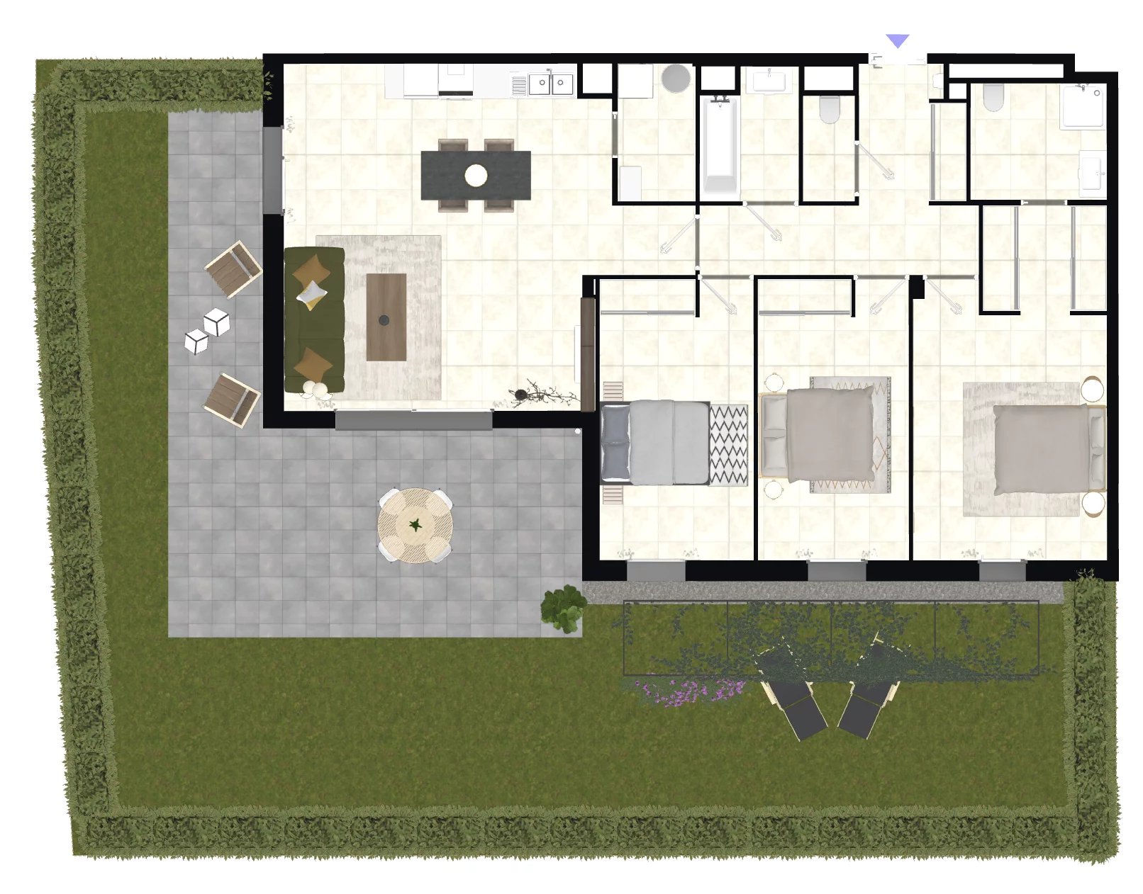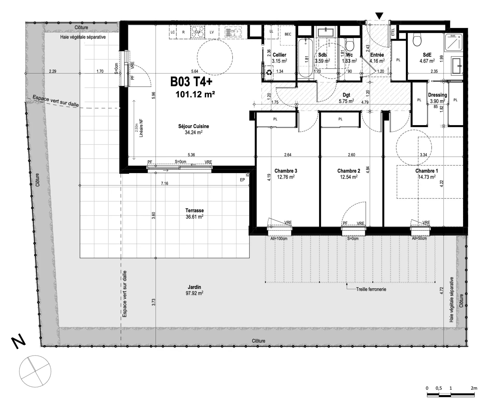 L’appartement développe 101,12 m² habitables et s’organise autour d’un vaste séjour/cuisine de 34,24 m², véritable cœur du logement. Cet espace de vie lumineux s’ouvre sur un vaste jardin privatif de de 97,92 m², prolongé par une terrasse de 36.61 m², offrant un ensemble extérieur exceptionnel de plus de 134 m², idéal pour recevoir, se détendre ou profiter des beaux jours en toute intimité.